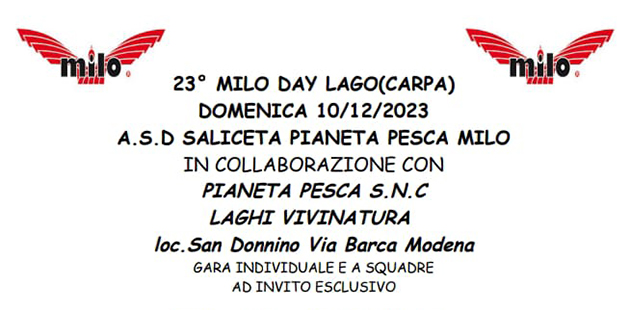 Ritorna il MILO DAY MODENA con la sua ventitreesima edizione. La manifestazione si svolgerà, come di consueto, ai LAGHI VIVINATURA (MO) il giorno 10 dicembre 2023. Gara a squadre.