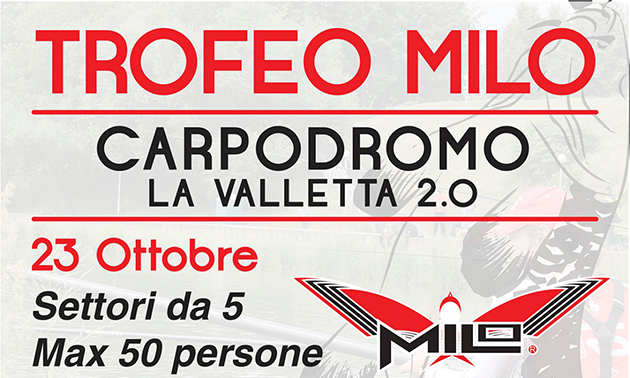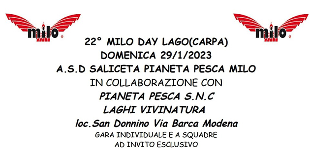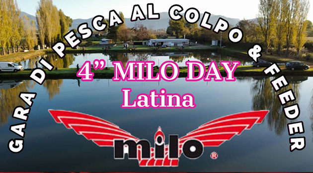 4° edizione del Milo Day Latina, gara individuale al colpo e feeder su 2 laghi, Carpodromo e Lago Bianco. La manifestazione si terrà il 4 dicembre 2022. Verrano presentate le novità MILO 2023.