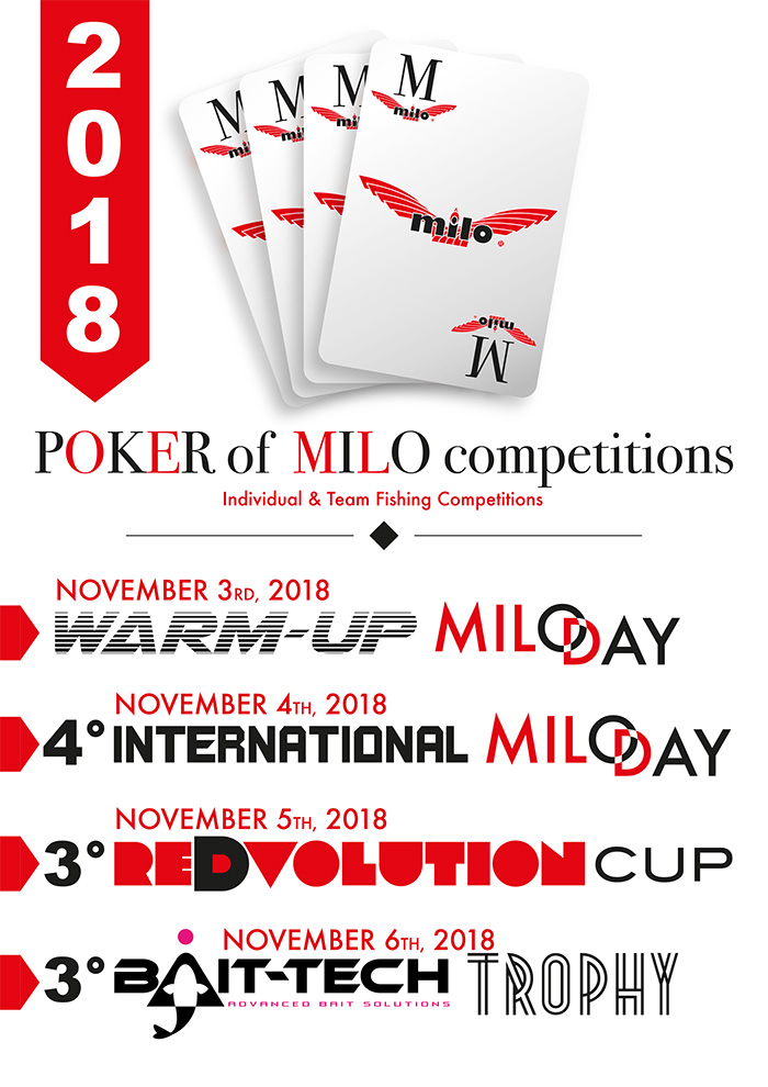 IT  Quattro gare di pesca, a squadre ed individuali, targate MILO che si svolgeranno nei giorni 3/4/5/6 Novembre. Le iscrizioni termineranno il giorno 26 Ottobre 2018.