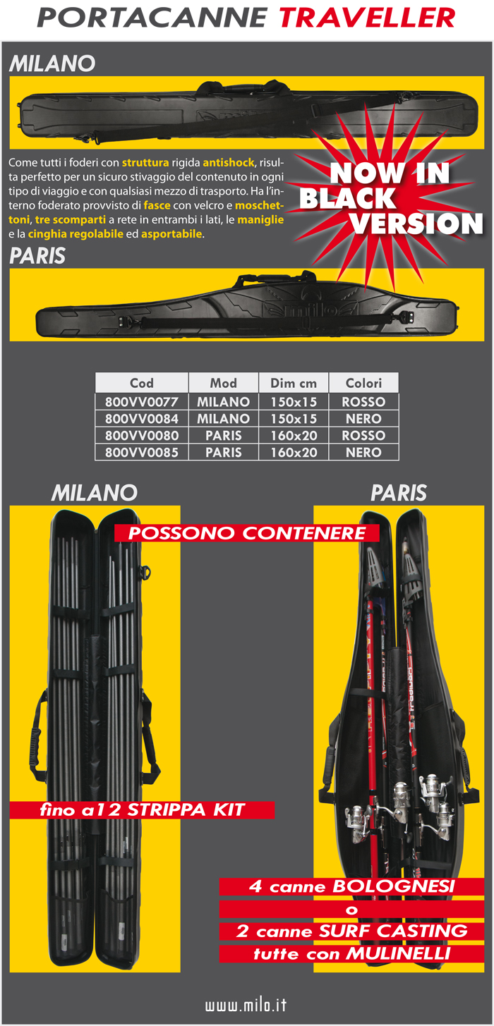 IT PARIS - Come tutti i foderi con struttura rigida antishock, risulta perfetto per un sicuro stivaggio del contenuto in ogni tipo di viaggio e con qualsiasi mezzo di trasporto. Può contenere 4 canne bolognesi o 2 canne da surf casting, tutte già equipaggiate di mulinello. Ha l'interno foderato provvisto di fasce con velcro e moschettoni, tre scomparti a rete in entrambi i lati, le maniglie e la cinghia regolabile ed asportabile. Altezza 160 cm. Larghezza tasca 20 cm. ROSSO: Cod. 800VV0080 - NERO: Cod. 800VV0085